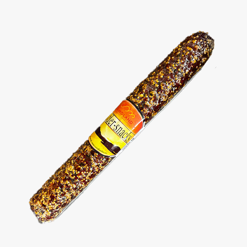 Krydder Snacks 500g er en rødvinspølse med krydder som dekker utsiden, og gir en intens og aromatisk smak. Denne pølsen er perfekt som pålegg, men passer også godt på spekebordet eller som en smakfull snacks til tapas.